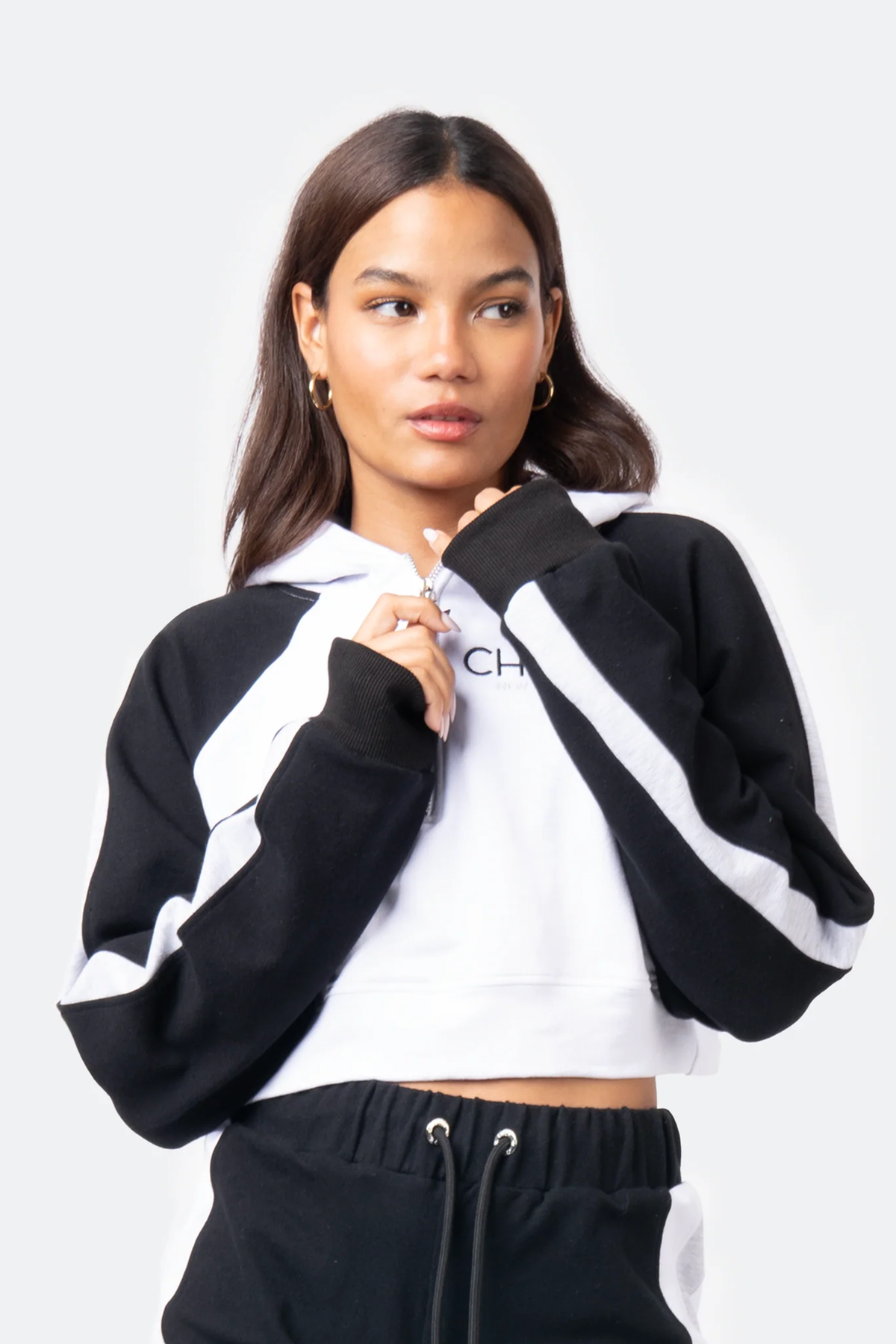 This classic set features a quarter-zip hoodie that has single-striped sleeves and color-blocked arms. It has “CHICK” on the upper left, with a crowned letter “I”. On the zipper, the emblem is placed again, symbolizing self-empowerment. Matching with the hoodie is a choice between mid-length shorts or joggers. Both bottoms include dual-colored stripes on each side, plus an adjustable drawstring waistband.