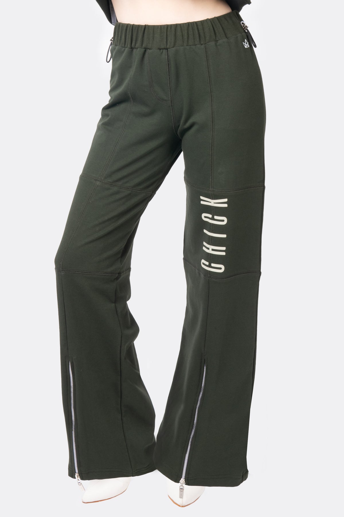 CHICK has turned streetwear up on its head with this next-level look. These wide-legged sweatpants feature a zipper through the bottom center of each pant leg, for the option of a flared aesthetic. To make them even more unique, they have a cargo-like stitching, with various seams running through and across the legs. In vertical letters, “CHICK” is written just above the left knee, for an extra pop.