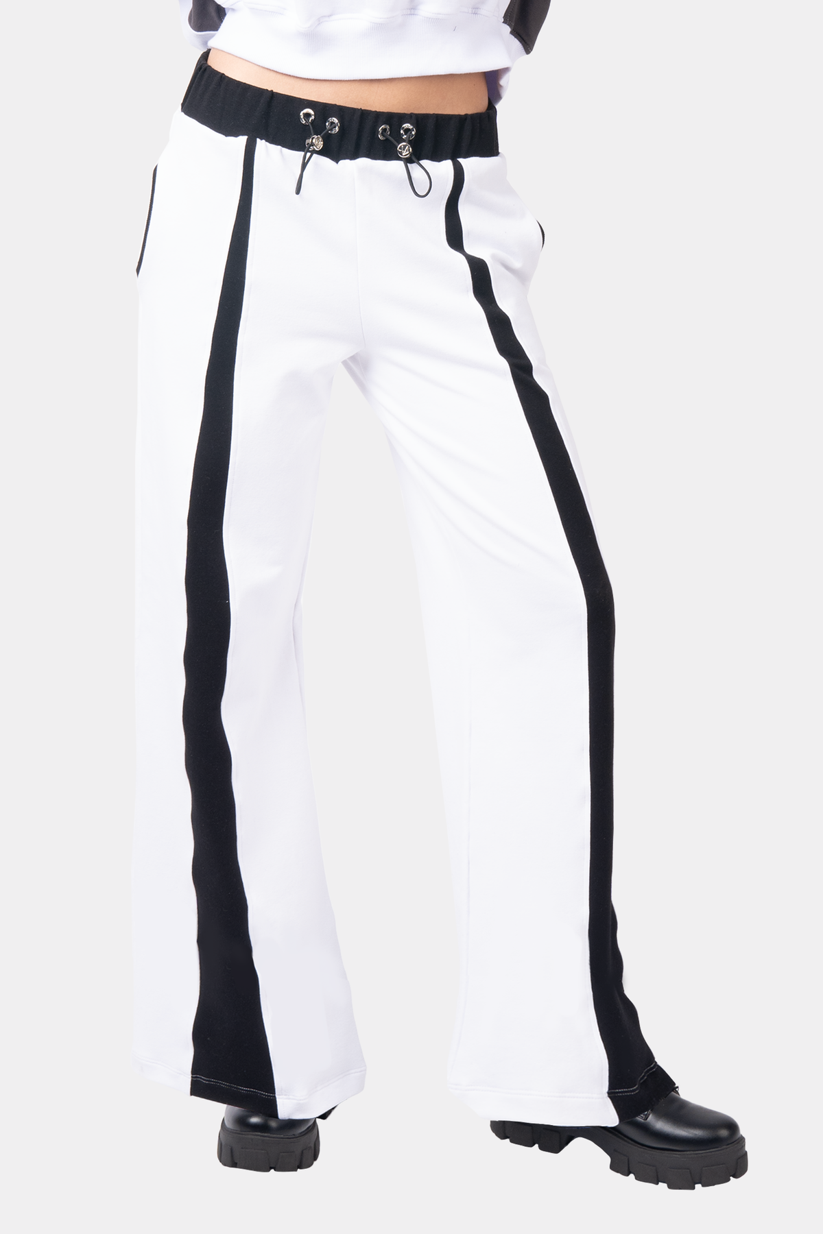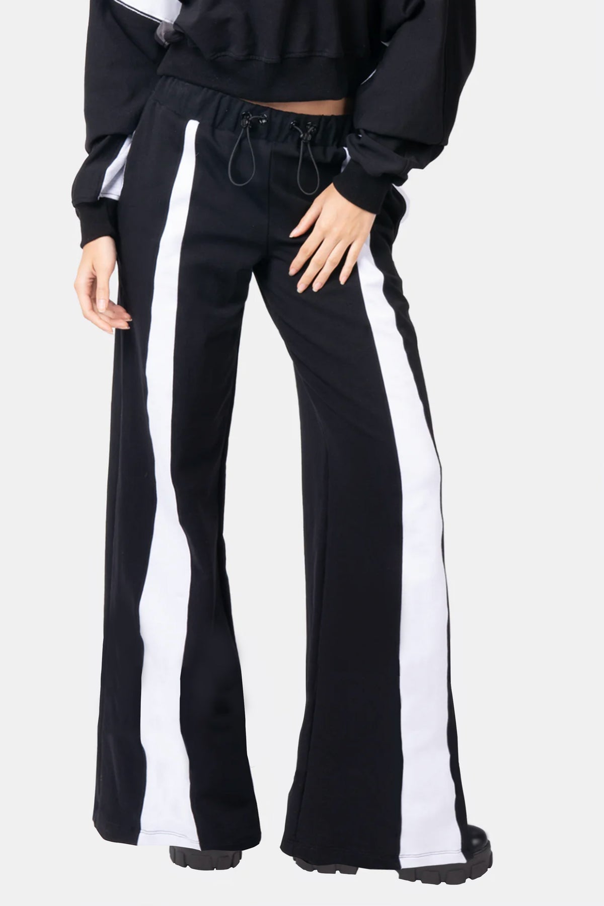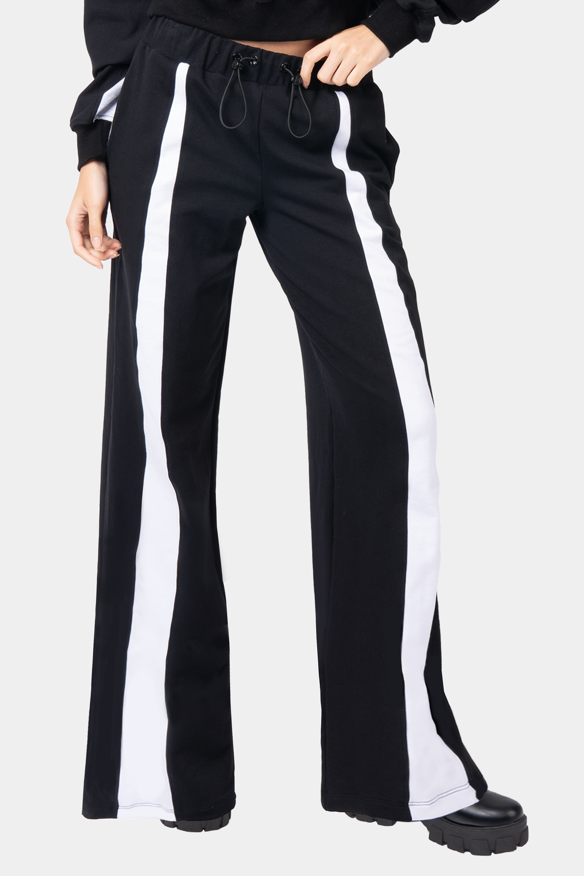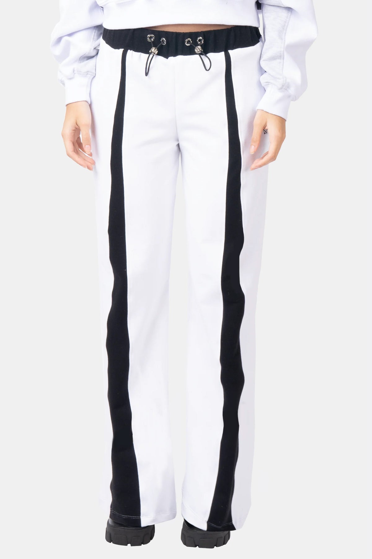 Step into your new favorite style of sweatpants. The cut is straight leg with pockets, in conjunction with a drawstring waistband that loops into two simple twists. Most notable is the tapering stripe from each ankle upward, connecting at the waist.