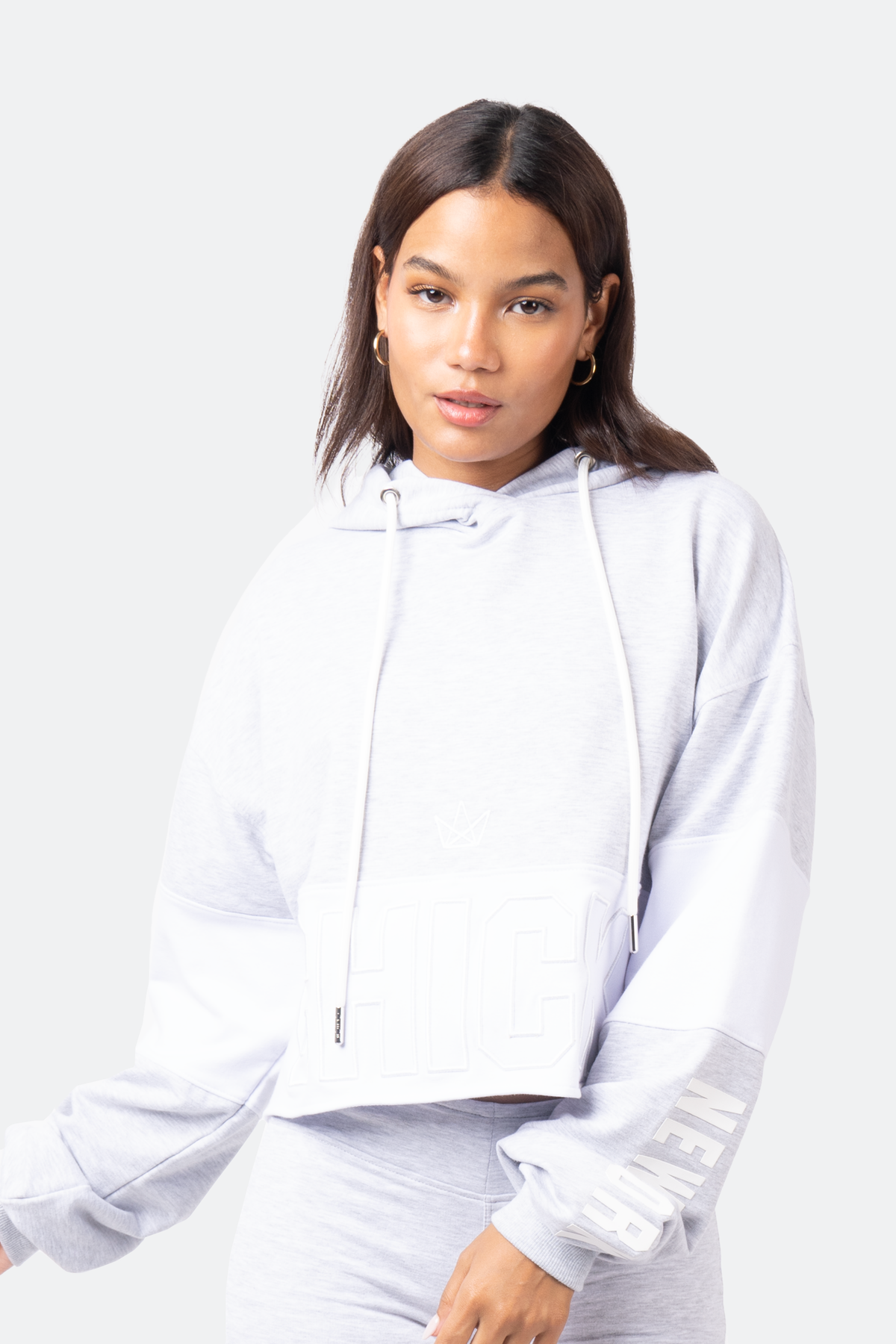 This unique hooded sweatshirt offers the “CHICK” lettering in monochrome along the lower half of the slightly cropped trim. The crown logo sits above it, in symbolism of empowerment. The sleeves are asymmetrical in design, where one has two stripes running along the forearm and one has “New York” written proudly.