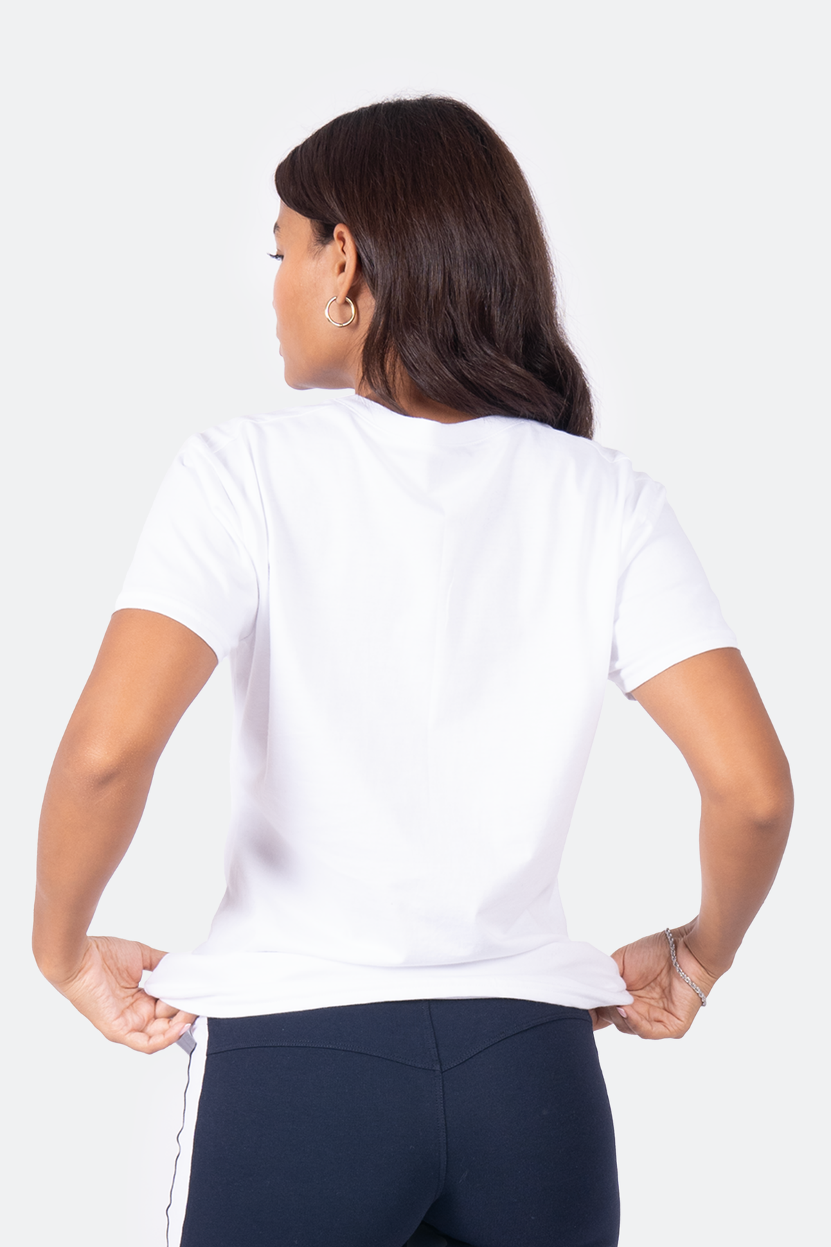 Own the room in a sleek, sophisticated way with a top that is gracefully trendy. It’s accented with heather gray “CHICK” in all caps, atop a pure white v-neck tee. Stricken through the center of the name is a thin white line containing “New York”, written in bold.