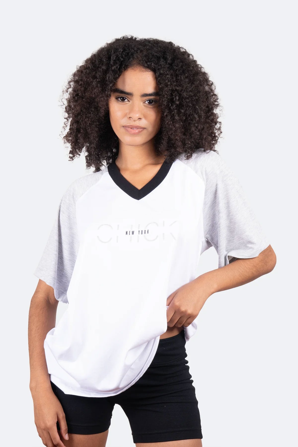 This sporty v-neck offers an oversized fit, for a relaxed, cool-girl vibe. The light gray baseball sleeves offset the solid white base, interrupted by a jet black neckline. Along the upper center is “CHICK” with “New York” overlaid. Pair this tee with baggy cargo pants to pull the look together.
